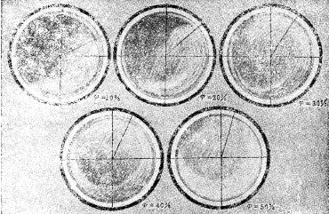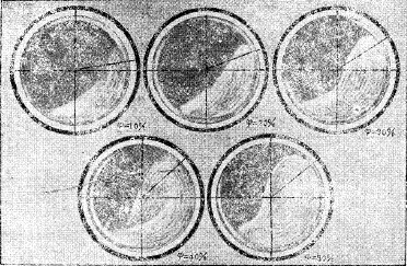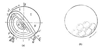 如果磨機的轉(zhuǎn)速不高,全部球荷向上偏轉(zhuǎn)一定角度,其中每個鋼球都繞自己的軸線轉(zhuǎn)動。當(dāng)球荷的傾斜角超過鋼球在球荷表面上的自然休止角時,鋼球即沿此斜坡滾下。鋼球的這種運動狀態(tài),叫做瀉落,如圖3-1-2中的(a)。在瀉落式工作的磨機中,礦料在鋼球間受到磨剝作用。如果磨機的轉(zhuǎn)速足夠高,鋼球自轉(zhuǎn)著隨筒體內(nèi)壁作圓曲線運動上升至一定高度,然后紛紛作拋物線下落。鋼球落下的地方,叫底腳區(qū),其中的鋼球強烈地翻滾。這種運動狀況,如圖3-2-1中的(b),叫做拋落。在拋落式工作的磨機中,礦料在圓曲線運動區(qū)受到鋼球的磨剝作用,在底腳區(qū)受到落下的鋼球的沖擊和強烈翻滾著的鋼球的磨剝。倘若磨機的轉(zhuǎn)速高到超過某一臨界值,鋼球就貼在襯板上不再落下。這種狀態(tài)叫離心運轉(zhuǎn),知圖3-2-1中的(c)。發(fā)生離心運轉(zhuǎn)時,礦料也是貼著襯板的。以上這些情形,都是指磨機內(nèi)裝有一定數(shù)量的鋼球說的。要是磨機內(nèi)只有少量的球,它們只是在磨機內(nèi)較低點擺動,并不發(fā)生上面講的三種情況。用拍攝磨機內(nèi)的介質(zhì)的運動狀態(tài)來研究它的運動規(guī)律,本世紀的二十年代已經(jīng)開始,豪爾太恩、戴維斯、列文遜和我國的王仁東,都先后做過這方面的工作。鋼球作瀉落式運動的力學(xué)尚缺乏研究,以后只講拋落式的。再詳細地看看下面幾張關(guān)于拋落式和離心運轉(zhuǎn)的照片。