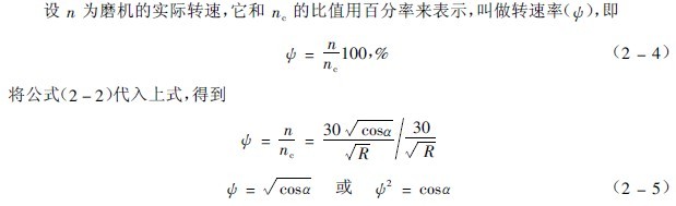 即角a標志鋼球開始拋落時已升到的位置,叫做脫離角。公式(2-5)指出,轉(zhuǎn)速率愈高,脫離角愈小,鋼球上升到的位置愈高。當(dāng)脫離角為0時,轉(zhuǎn)速率為1,即實際轉(zhuǎn)速已等于臨界轉(zhuǎn)速,鋼球到了磨機的頂點,要開始離心化了。