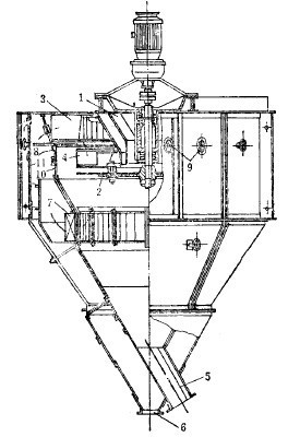 通過式離心分級器(見圖3),主要用于與干式磨機(jī)閉路工作。設(shè)備主要由外錐1和內(nèi)錐2組成,上部裝有導(dǎo)向葉片5,使由內(nèi)外錐之間上來的氣流呈切線進(jìn)入內(nèi)錐。磨機(jī)產(chǎn)物與氣流一起從底部管道中以大約18~20米/秒的速度向上供入,進(jìn)入內(nèi)外錐之間的環(huán)形空間后,因過流斷面變大,速度降至4~6米/秒,于是,粗的礦粒落下,由管4中排出,返回磨機(jī)再磨。其他礦粒被氣流帶著往上行,經(jīng)葉片5,呈切線進(jìn)入內(nèi)錐,產(chǎn)生回旋運(yùn)動。在慣性離心力作用下,較粗的礦粒被拋到內(nèi)錐壁上,然后下落,由排礦管6排出。這種產(chǎn)物或作為產(chǎn)品,或者返回磨機(jī),視情況而定。細(xì)礦粒隨氣流從頂部管道中排出,至集塵器中收集,為細(xì)粒產(chǎn)物。