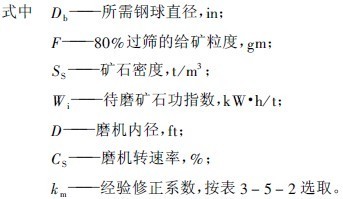 式(5-2)不能直接使用,必須針對特定礦石作兩組試驗,列出兩個方程式成一組,從方程組求解出i及n才能得出特定的球徑方程式,方可應(yīng)用。為了方便應(yīng)用,K.A拉蘇莫夫提出,對中硬礦石可以直接使用下面的簡便計算式計算Db(mm)