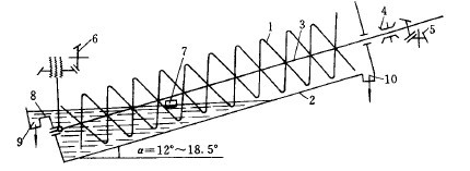 螺旋分級(jí)機(jī)的結(jié)構(gòu)如圖3-4-15所示。分級(jí)槽2呈傾斜安置,傾角一般為12。~18.5。,槽的底部為半圓形。礦漿從槽的中間部位進(jìn)料口7給入,在分級(jí)槽下端的分級(jí)帶完成分級(jí)。細(xì)粒級(jí)經(jīng)槽子下端溢流堰8隨水流從溢流排出口9排走。粗粒級(jí)產(chǎn)物在分級(jí)帶沉降,然后由螺旋1將其運(yùn)至槽子上端的沉砂排出口10排出機(jī)外。螺旋安裝在中空主軸3上,主軸兩端由軸承4支承,軸的上端設(shè)有傳動(dòng)裝置5,軸的下端置于提升機(jī)構(gòu)之內(nèi),必要時(shí)可調(diào)節(jié)螺旋在槽內(nèi)的高度。