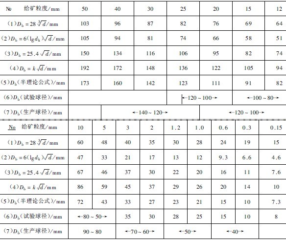 球徑半理論公式初步的驗證分析可以采取計算結果比較分析的辦法。由于各個常見的球徑經驗公式均為選礦工作者們所用過,并對它們的準確性和適用范圍作了一些結論,因此,可以將球徑半理論公式和各個常見球徑經驗公式同時用于計算相同磨礦條件。