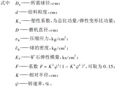 為半徑的區域屬磨礦范圍,Db及d的配合應保證磨碎速度常數有大的值,因磨碎速度常數與給礦粒度d之間屬單峰函數,只有給礦粒度為某一恰當值時才能有較大的磨碎速度常數。G.M-empel認為,磨機的材質和直徑已定,且保持轉速,球的充填率為較佳狀態,所以供給的勢能只要改變球徑就能發生變化,并提出由較大的起始磨礦速度來確定更好的球徑的方法。有的研究者認為,為了使磨機有效地工作,必須具有正確地選擇球徑的方法,并認為以前考慮的因素中以巖石為對象的很少,很難測定(如松泊比),故提出充分考慮磨機影響參數和巖石機械性能來確定球徑的方法: