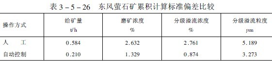 我國東風螢石公司浮選廠和首鋼大石河選礦廠磨礦分級自動控制經驗表明,采用自動控制系統時,磨礦操作的各項指標的波動范圍均比人工操作小(見表3-5-25和表3-5-26)。