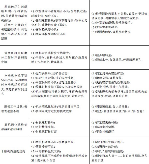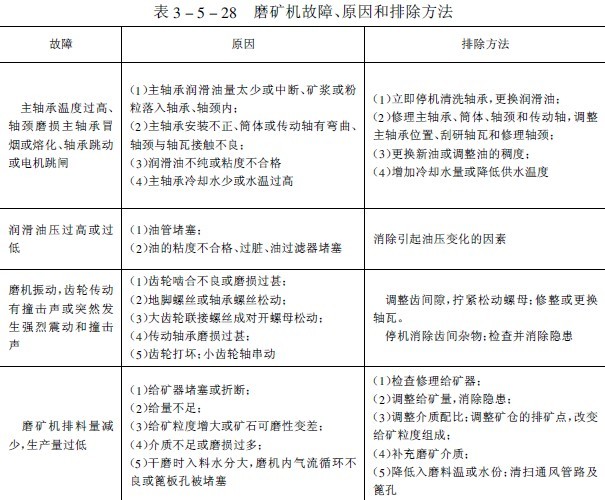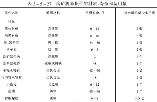 我國選礦廠生產實踐中球磨機易損件的材質、使用壽命和設備用量列入表3-5-27中。常見故障、原因和排除方法見表3-5-28。