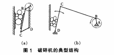 顎式破碎機(jī)兩種典型結(jié)構(gòu)如下圖1所示。圖1-a所示顎式破碎機(jī),由機(jī)架AD、曲軸AB、 動顎板BC、肘板CD組成。圖1-b所示的顎式破碎機(jī),曲柄AB帶動連桿BC和搖桿CD運(yùn)動,它與前一類顎式破碎機(jī)雖然采用相同的曲柄搖桿機(jī)構(gòu),但工作原理不同。