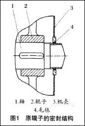 該型破碎機(jī)的輥?zhàn)优c機(jī)殼間的密封過(guò)去采用毛氈密封,其結(jié)構(gòu)見(jiàn)圖1。毛氈對(duì)空氣的密封效果不好,環(huán)境干燥,使用不久毛氈就會(huì)磨損,造成嚴(yán)重的漏灰現(xiàn)象。